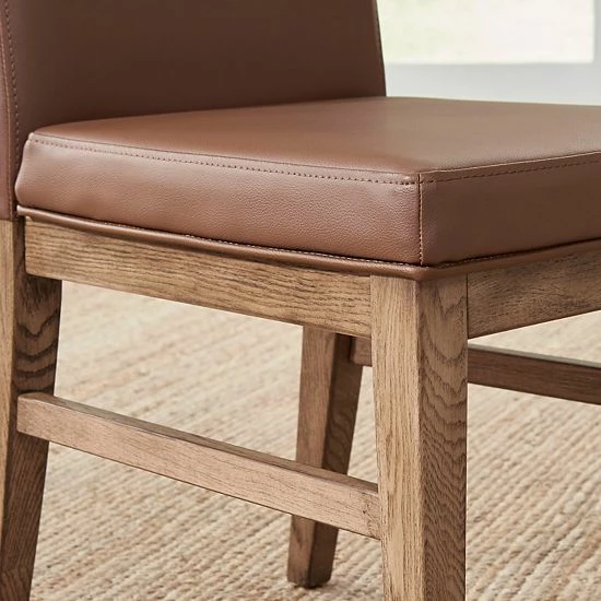 - Frame crafted from hardwood solids and straight grain oak veneers over engineered wood with a wire-brushed texture