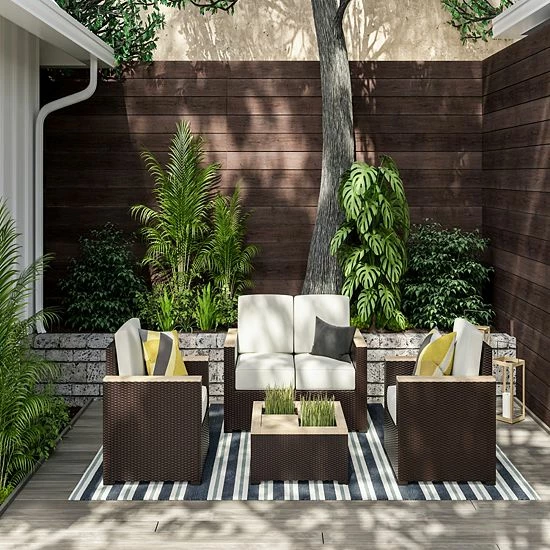 Turn your backyard or patio into a stylish oasis with this homestyles Palm Springs Outdoor Loveseat, Chairs & Coffee Table 4-Piece Set.