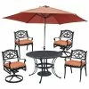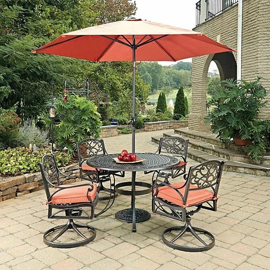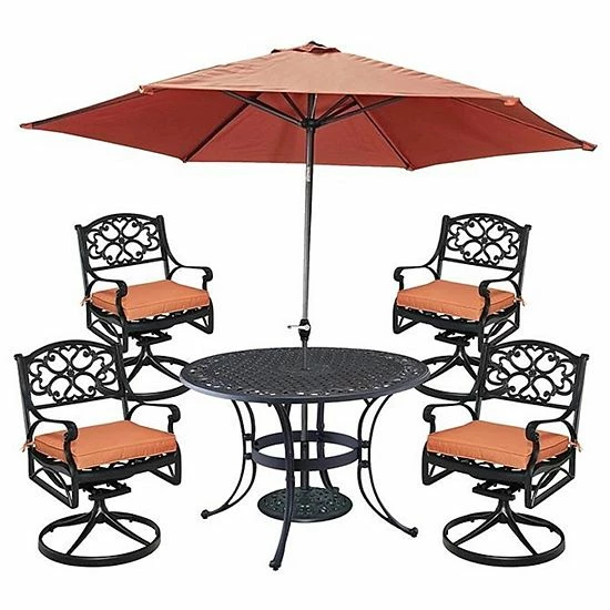 Finish your patio decor with this homestyles Patio Dining Table, Swivel Chair, & Umbrella 6-piece Set.