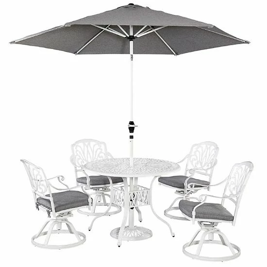 Relax in the sun with this homestyles Patio Swivel Table, Chairs, & Umbrella 6-piece Set.