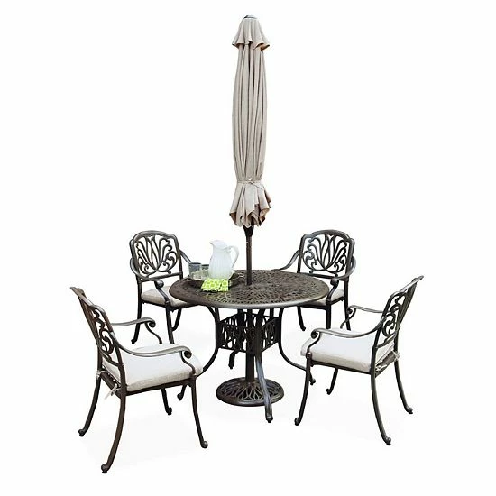 Relax in the sun with this homestyles Patio Table, Chairs, & Umbrella 6-piece Set.